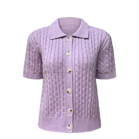 Özel kadınlar Polo yaka düğmesi kapatma % 100% pamuk yaz kırpılmış rahat kablo kısa kollu kazak Tops örgü hırka